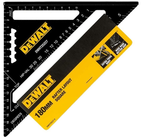 - 7-calowy (180mm) kątownik krokwiowy ma wyjątkowo gruby aluminiowy korpus do intensywnego użytkowania, a także wytłoczony kontrastowymi podziałkami kolorów dla lepszej czytelności.