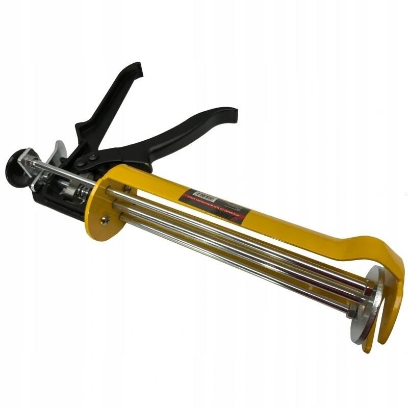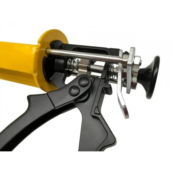 Wyciskacz do mas gęstych. Lekki, wykonany z blachy stalowej, lakierowany. Wygodny, profilowany, ergonomiczny uchwyt, pozwala na skuteczne aplikowanie mas gęstych np. silikonu, klejów, uszczelniaczy, smarów itp. Wzmocniona konstrukcja, potrójne prowadzenie tłoka, zwiększa siłę nacisku i skuteczność aplikacji, szczególnie istotne przy wyciskaniu gęstych, kleistych substancji lub podczas pracy w niskich temperaturach twardniejące masy są trudne do wyciśnięcia i powodują często zniszczenie słabych wyciskaczy.
