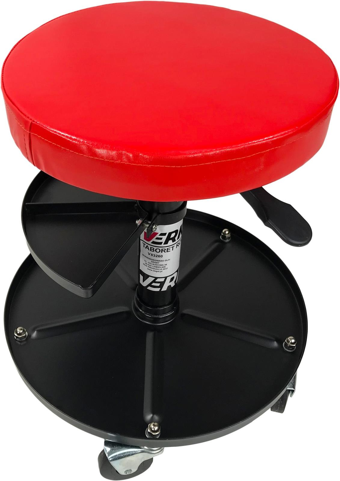 Taboret warsztatowy firmy Verke zaprojektowano do użytku w profesjonalnych warsztatach, serwisach samochodowych, zakładach naprawczych, a także świetnie się sprawdzi w przydomowym garażu. Siedzisko warsztatowe obraca się oraz posiada 5 kółek, które zwiększają jego mobilność. Praktycznym rozwiązaniem jest wyposażenie go w dodatkową półkę, gdzie mechanik może umieścić wykorzystywane podczas wykonywanych prac przybory. Powłoka komfortowego siedziska została wykonana z PVC. Dzięki pneumatycznej regulacji wysokości da się go łatwo dostosować do wzrostu danej osoby.