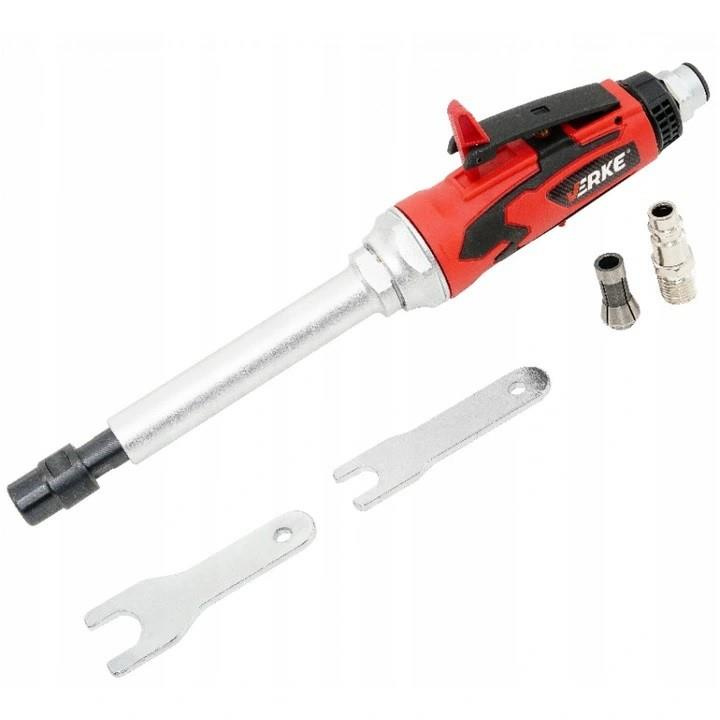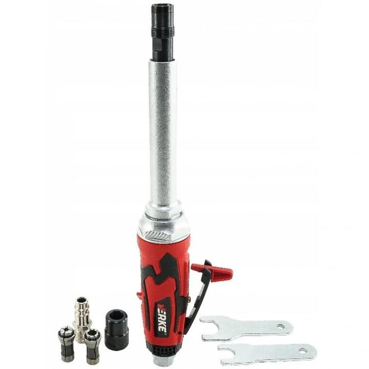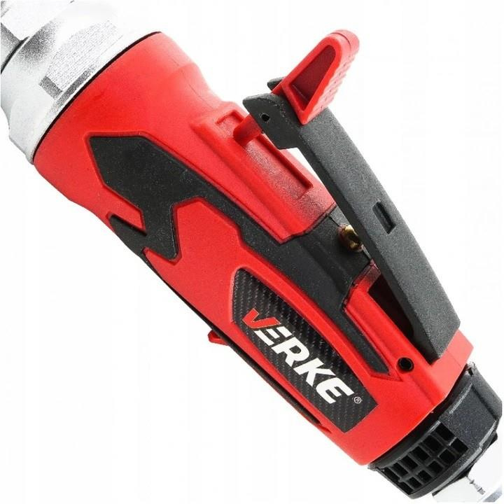 Profesjonalna szlifierka pneumatyczna firmy VERKE. Wykonana została z najlepszej jakości materiałów, posiada gumowaną rękojeść zapobiegającą ślizganiu się podczas pracy. Wyposażona została w blokadę zabezpieczającą przed nieostrożnym uruchomieniem. Szlifierka współpracuje z kamieniami szlifierskimi z trzpieniami o średnicy 3 mm oraz 6 mm. Posiada regulację obrotów. Długość całkowita 295 mm pozwala na bezpieczną i wygodną pracę. Znajduje zastosowanie w warsztatach, serwisach i przydomowych garażach. Przeznaczona jest do prac w trudno dostępnych miejscach (cięcie tłumików, śrub, rur, elementów karoserii ). Grot długości 125 mm.