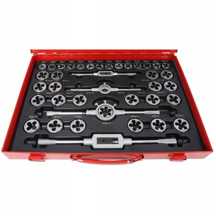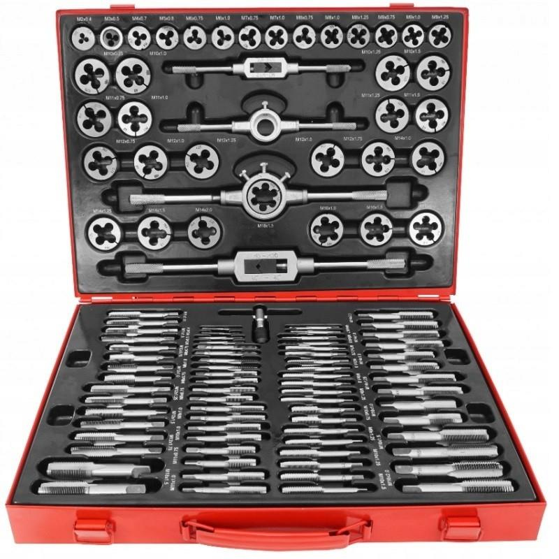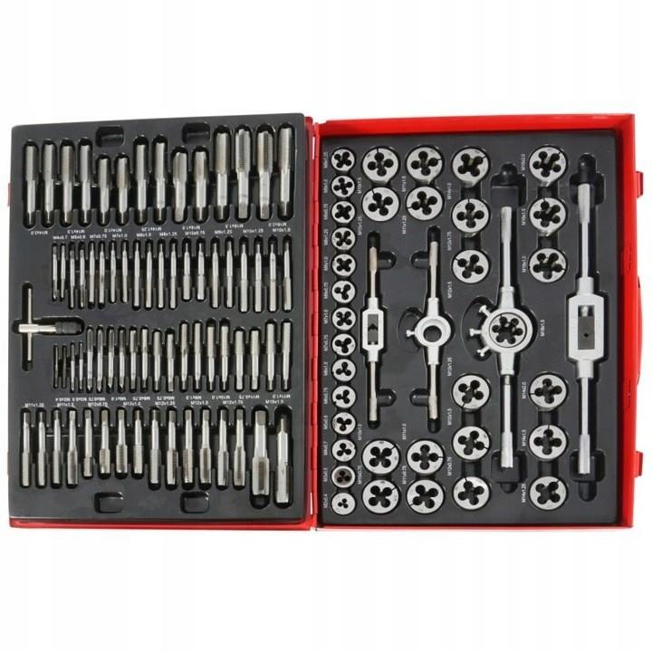 Profesjonalne gwintowniki i narzynki wykonane z doskonałego materiału. Zestaw zawiera 110 elementów. Zapakowany w wygodną walizkę, która pozawala utrzymać porządek, łatwo transportować zestaw i błyskawicznie odnaleźć potrzebny w danej chwili element. Zestaw służy do naprawy połączeń gwintowych różnego kalibru.