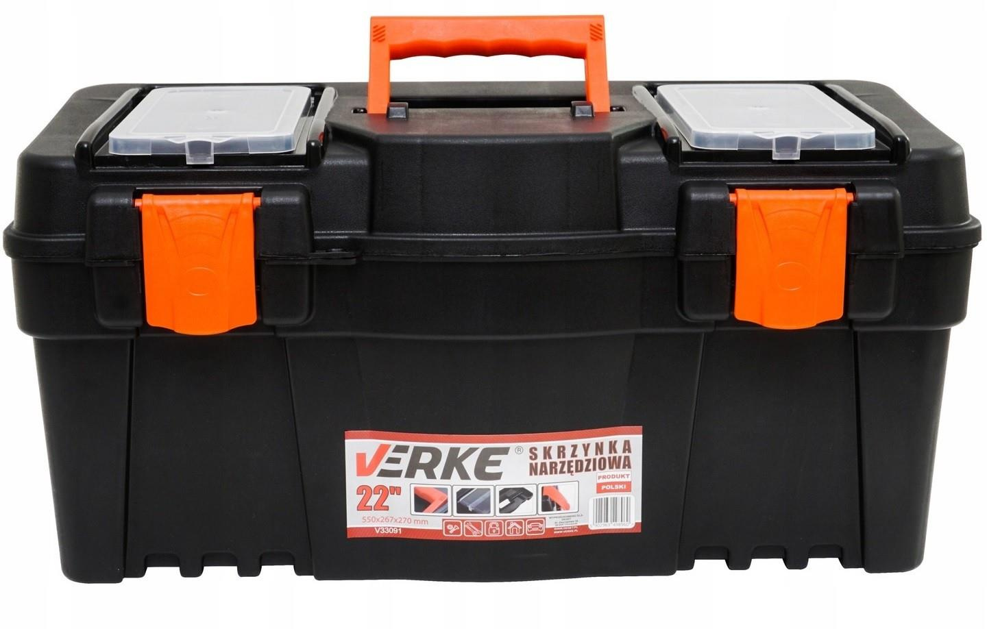 Wysokiej jakości, praktyczna i solidna skrzynka narzędziowa wykonana z wytrzymałego tworzywa sztucznego. Skrzynka VERKE jest wyposażona w praktyczne wewnętrzne nosidło oraz 2 duże zewnętrzne organizery wbudowane w pokrywę. Dzięki ergonomicznemu uchwytowi i podwójnemu bardzo mocnemu zapięciu można w niej przechowywać i przenosić aż do 19 kg ładunku. Wewnętrzna tacka z uchwytem. Idealny produkt dla profesjonalistów jak i amatorów ceniących porządek wśród narzędzi oraz mobilność podczas pracy.