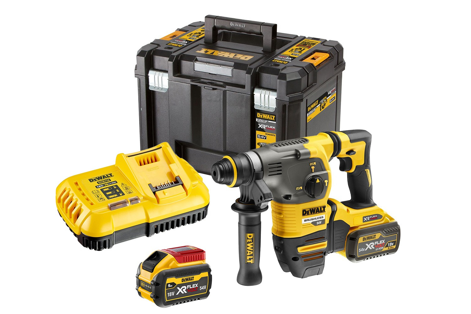 DeWALT DCH333X2 MŁOTOWIERTARKA 54V XR FLEXVOLT 3-funkcyjna SDS-Plus z silnikiem bezszczotkowym i uchwytem szybkomocującym + 2 akumulatory 9,0Ah + ładowarka + walizka TSTAK