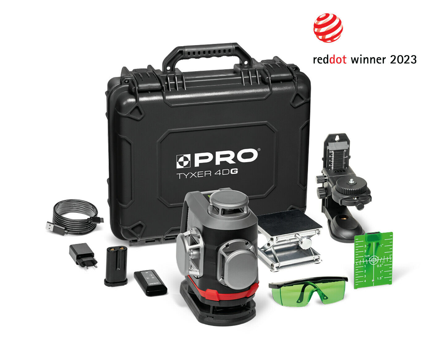 Laser wieloliniowy TYXER 4DG to urządzenie generujące cztery płaszczyzny 360°, składające się z dwóch poziomych i dwóch pionowych linii, przecinających się pod kątem 90°. Model TYXER 4DG został wyposażony w zdejmowany element stopy, który po demontażu umożliwia wyświetlenie dolnej wiązki już od 8,5 mm od podłoża.