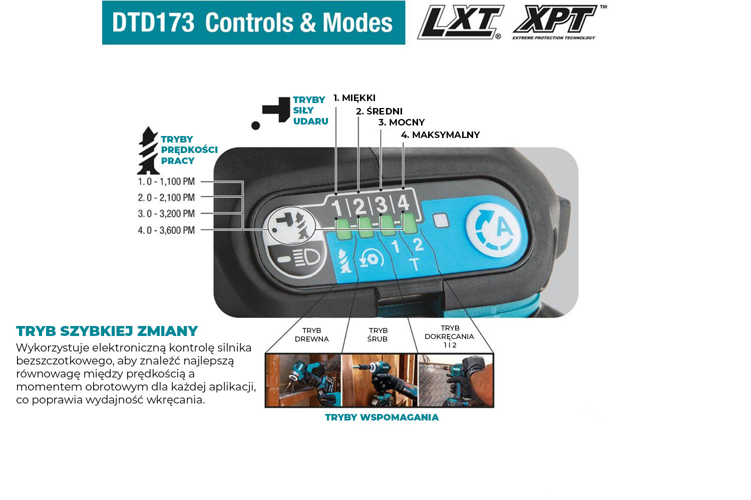 - Tryb śruby – automatyczne zatrzymanie po poluzowaniu (0,2 s)