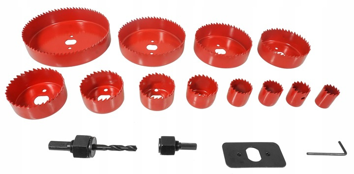 - 12 otwornic o średnicy: 19mm, 22mm, 25mm, 29mm, 38mm, 44mm, 51mm, 64mm, 76mm, 89mm, 102mm, 127mm