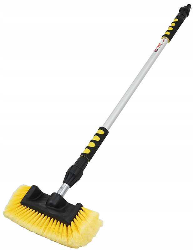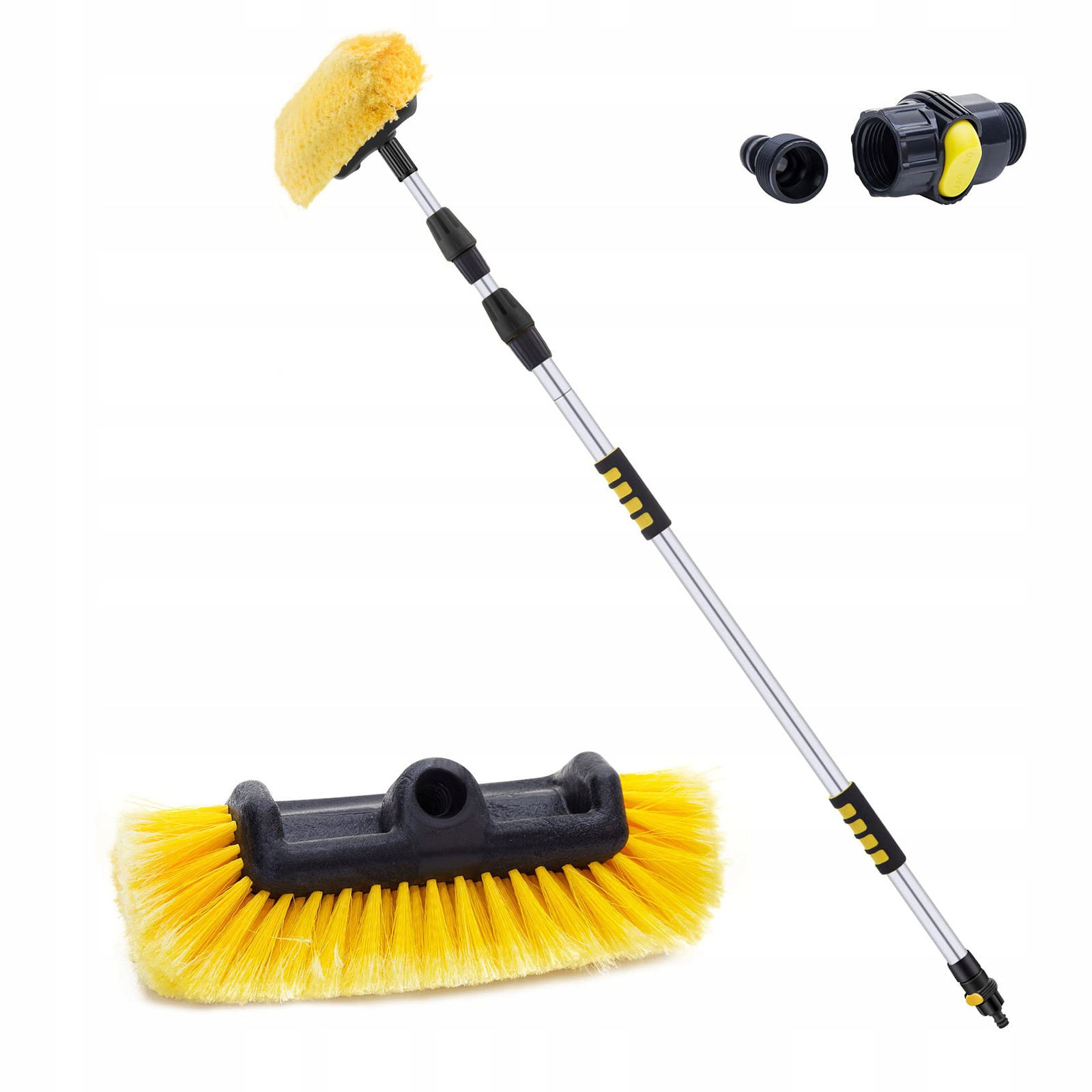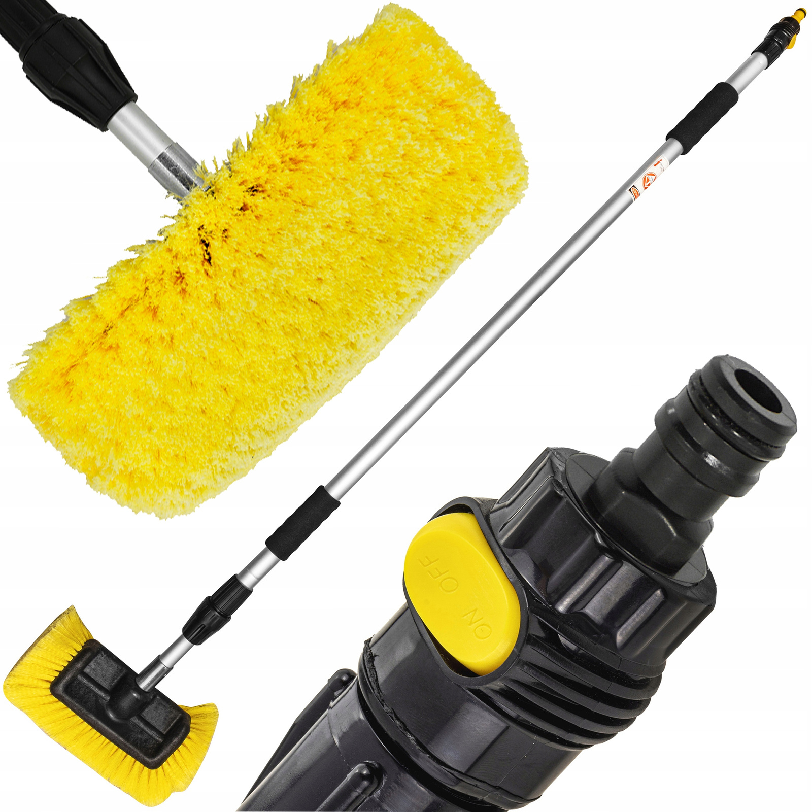 Przełącznik przepływu wody ułatwia kontrolę nad myciem, a zakończenie nyplem do szybkozłączki umożliwia szybkie podłączenie do węża. Szczotka jest idealna do mycia karoserii i szyb w samochodach ciężarowych, busach, łodziach oraz innych wysokich powierzchniach, zapewniając wygodę i efektywność pracy.