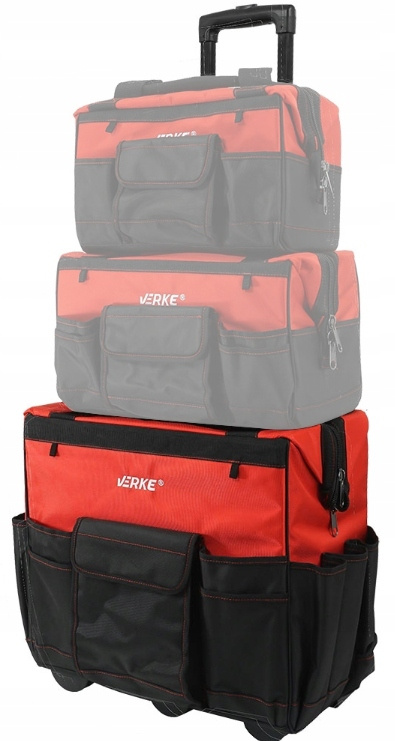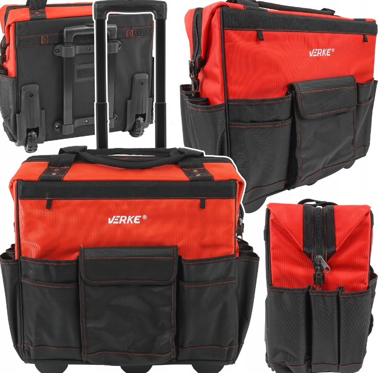 Torba narzędziowa Verke jest idealna do przechowywania i transportu narzędzi i akcesoriów na placu budowy lub w garażu czy warsztacie. Charakteryzuje się dyżumi wymiarami oraz sztywną konstrukcją co czyni ją bardzo poreczną oraz praktyczną torbą. Posiada wewnętrzne i zewnętrzne kieszenie do przechowywania wkrętaków, szczypiec i innych małych narzędzi. Duża komora zamykana na zamek zapewnia wygodny dostęp do narzędzi. Szwy oraz główny zamek wykonane w wersji wzmocnionej, przystosowane do dużych obciążeń. Teleskopowy uchwyt z blokadą wraz z mocnymi kołami ułatwi transport ciężkiej zawartości. Torba wyposażona jest w mocny uchwyt wzmocniony nitami. Materiał poliester 1680D. Tkaniny o splotach 1680D należą do grupy najbardziej wytrzymałych i trwałych materiałów. Gęsta gramatura zapewnia wyrobom wyjątkową wytrzymałość oraz odporność na różnego rodzaju uszkodzenia mechaniczne. Tkaniny charakteryzują się wyraźną strukturą splotu oraz posiadają dodatkowe powleczenie z PU. Taki sposób impregnowania wzmacnia materiał i nadaje tkaninie właściwości bryzgoszczelne.