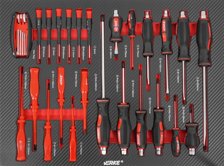 • Wkrętaki (12 sztuk): SL6*38 mm; 3*75 mm; 5*100 mm; 6*100mm; 6*150 mm;8*150mm | PH2 *38 mm; PH0*75mm;PH1*80mm; PH2*100mm;PH2*150mm;PH3*150mm