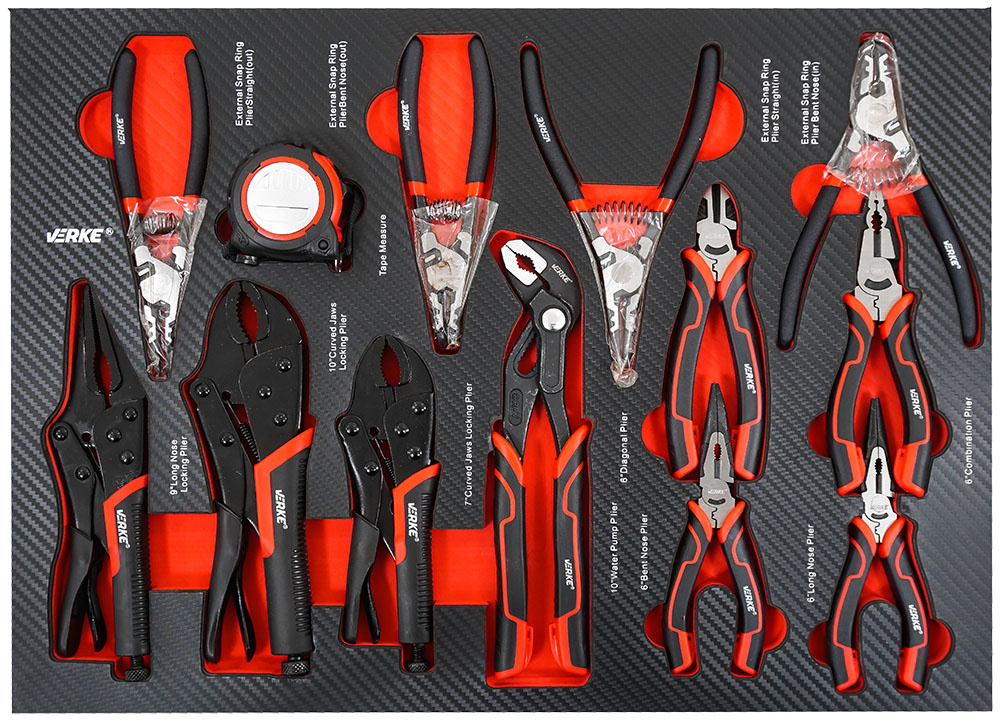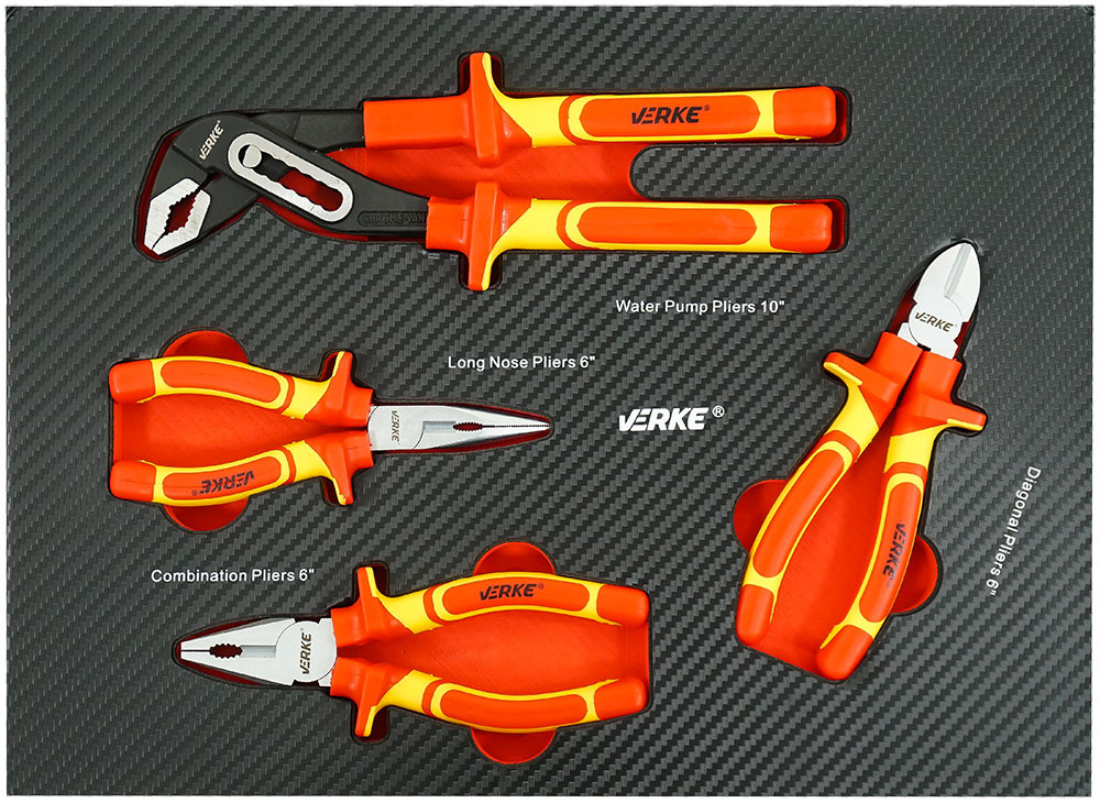 - 4 szt. - szczypce diagonalne 6", szczypce z długimi szczękami 6", kombinerki 6", klucz nastawny 10"