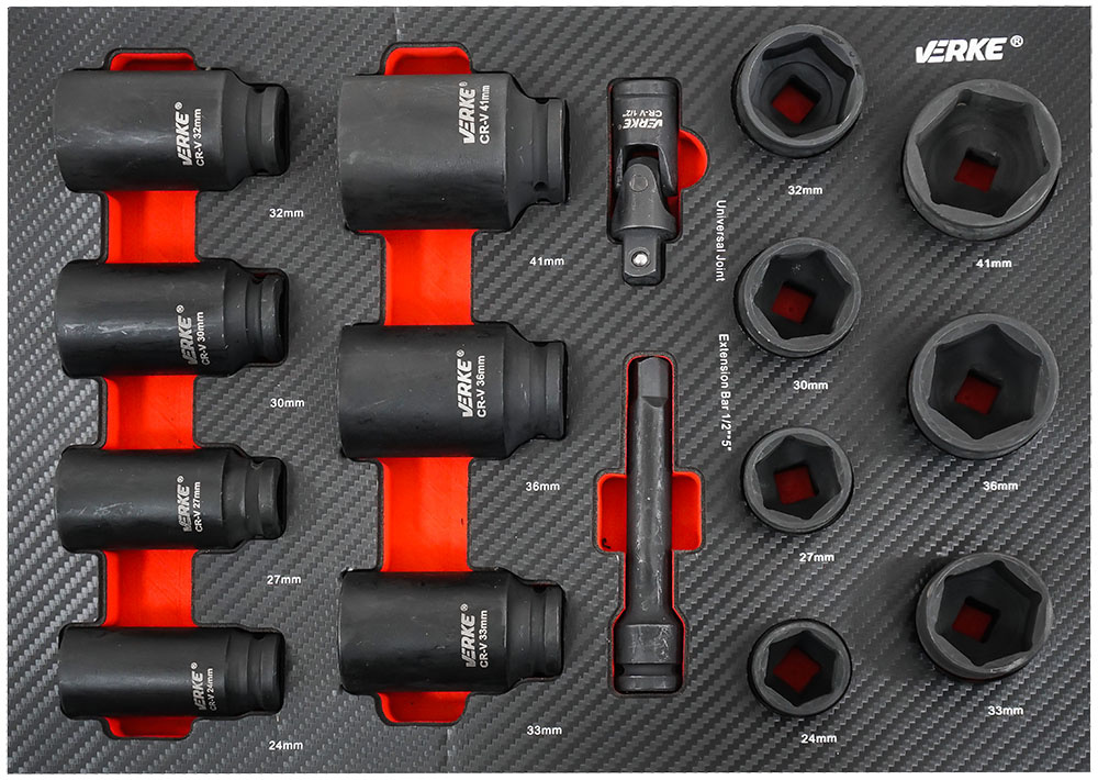 - 19 szt. - nasadek 6-kątnych 1/2”: 8, 9, 10, 11, 12, 13, 14, 15, 16, 17, 18, 19, 20, 21, 22, 24, 27, 30, 32mm