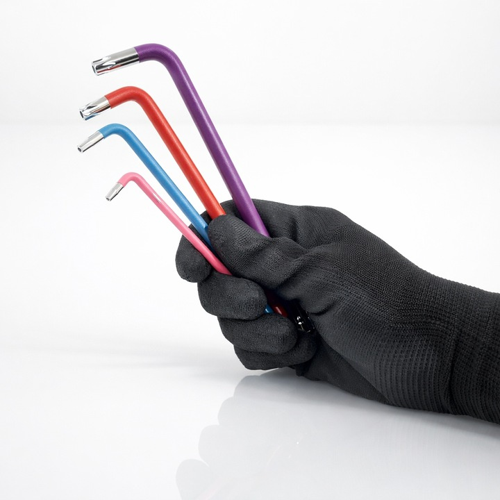 Każdy klucz TORX w zestawie posiada indywidualny kolor przypisany do konkretnego rozmiaru, co eliminuje konieczność odczytywania oznaczeń. Takie rozwiązanie pozwala natychmiast sięgnąć po właściwe narzędzie, zwiększając płynność i ergonomię pracy, szczególnie w dynamicznych warunkach warsztatowych.