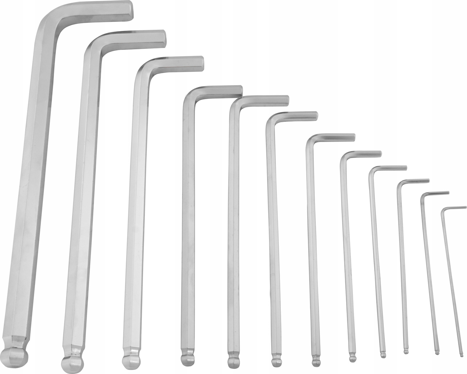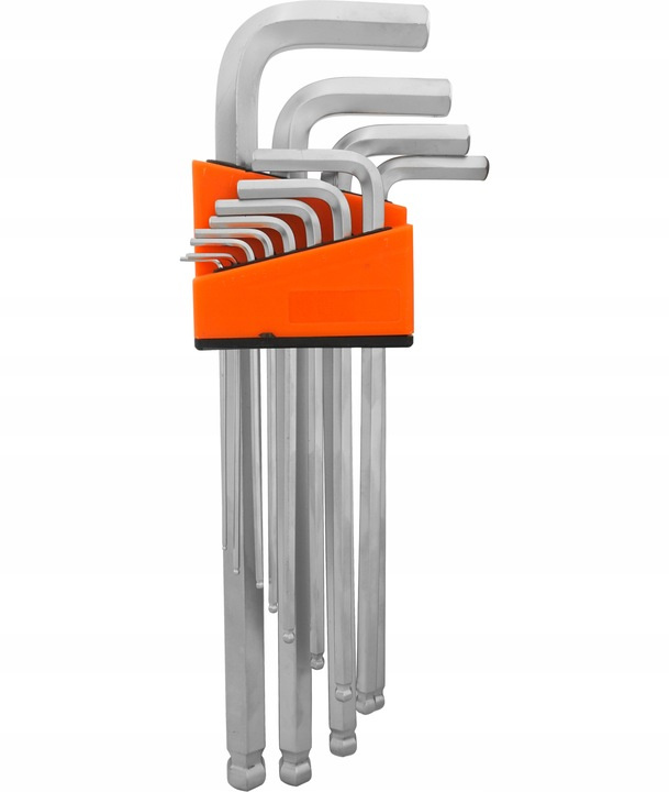 Idealny zestaw kluczy z końcówką IMBUS hex. Zestaw zapakowany w praktyczną i poręczną zawieszkę z tworzywa sztucznego, która ułatwia wyszukanie odpowiedniego rozmiaru klucza. Klucze wykonane z wysokiej jakości stali chromowo wanadowej CrV, charakteryzującej się wytrzymałością oraz sprężystością. Końcówka klucza zakończona została kulką, która umożliwia pracę pod kątem.