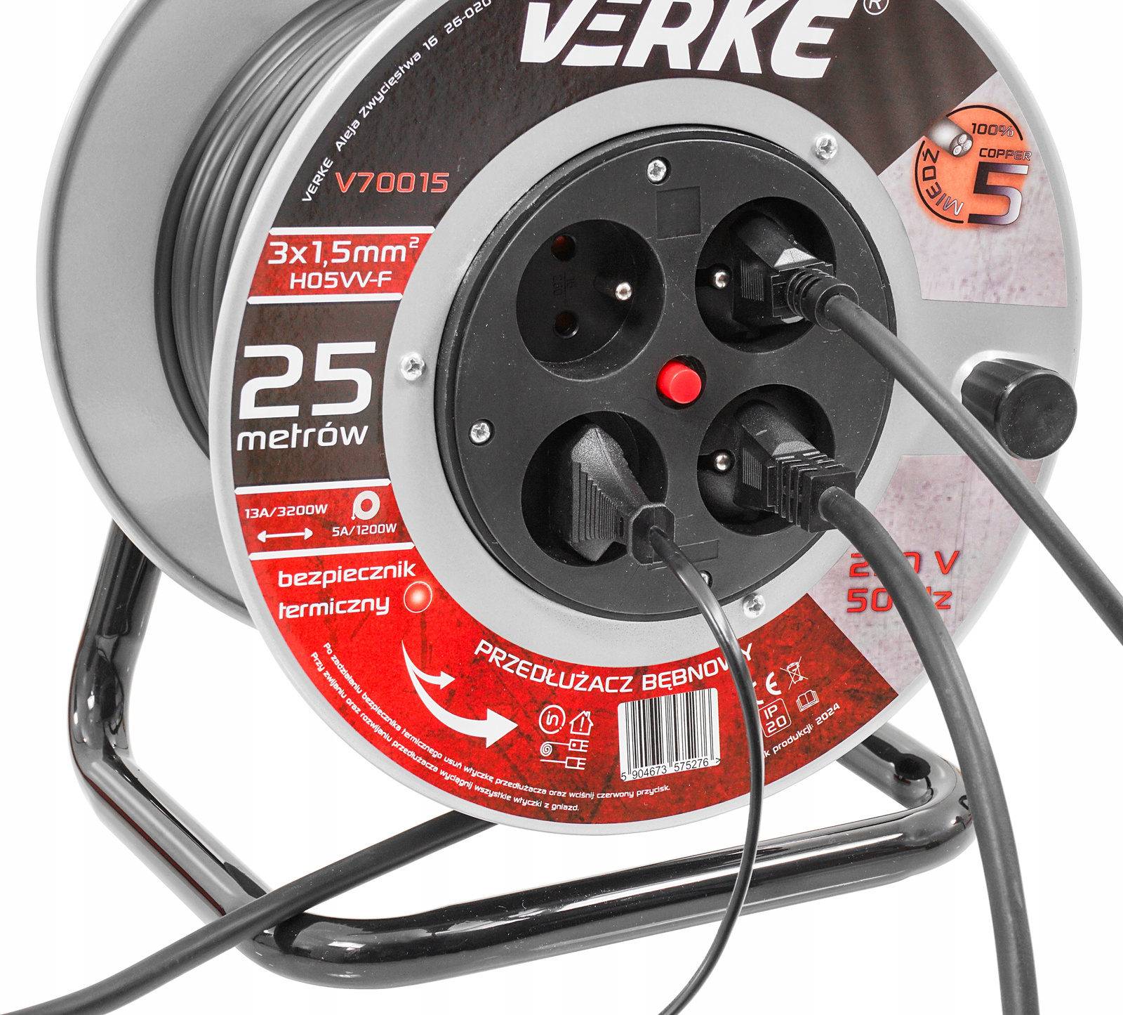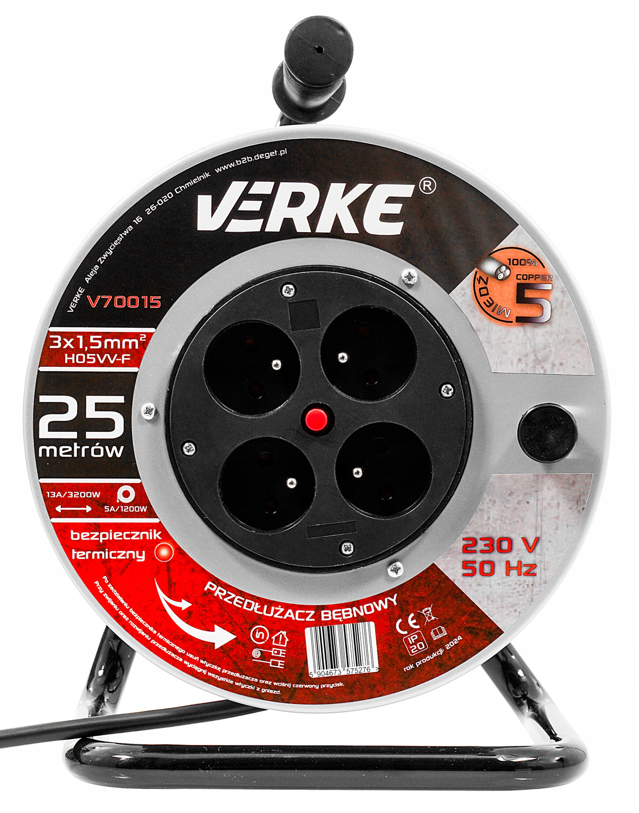 VERKE V70015 PRZEDŁUŻACZ ZWIJANY 3x1,5mm 25m 4 GNIAZDA