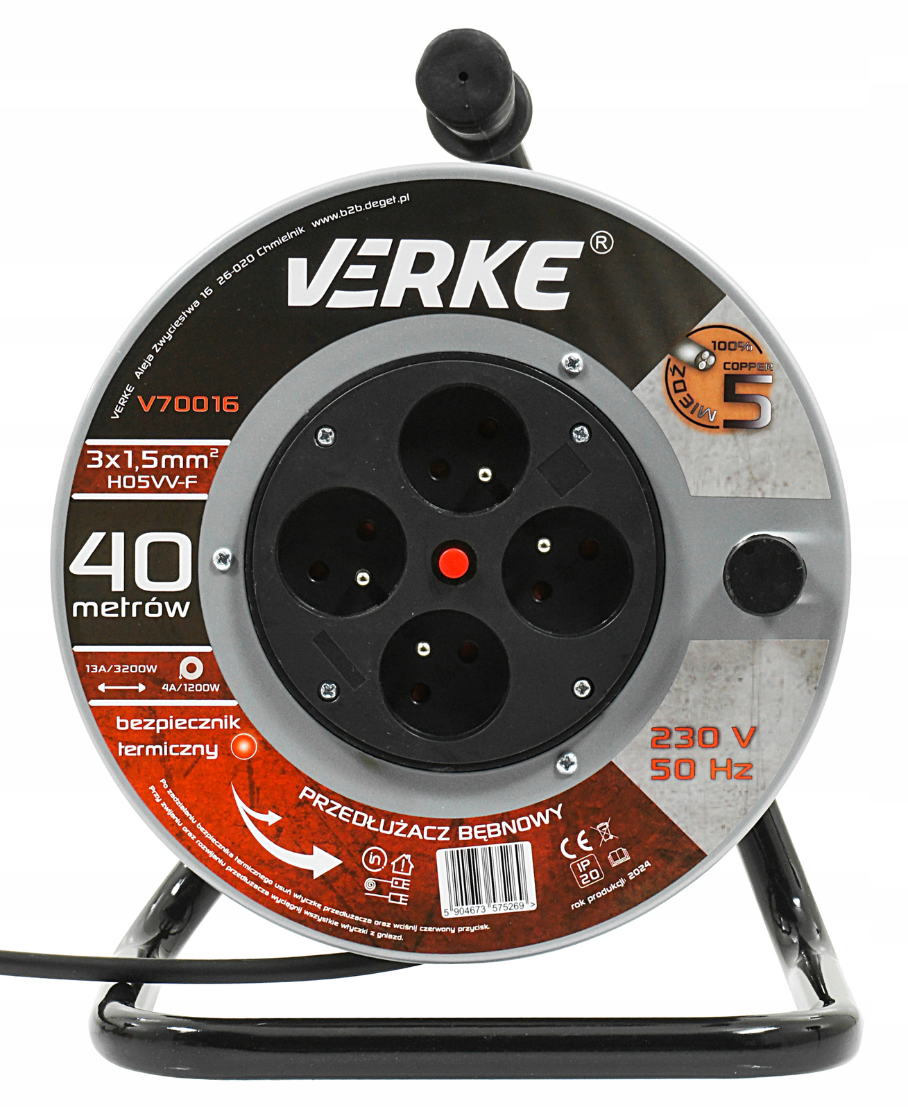 VERKE V70016 PRZEDŁUŻACZ ZWIJANY 3x1,5mm 40m 4 GNIAZDA