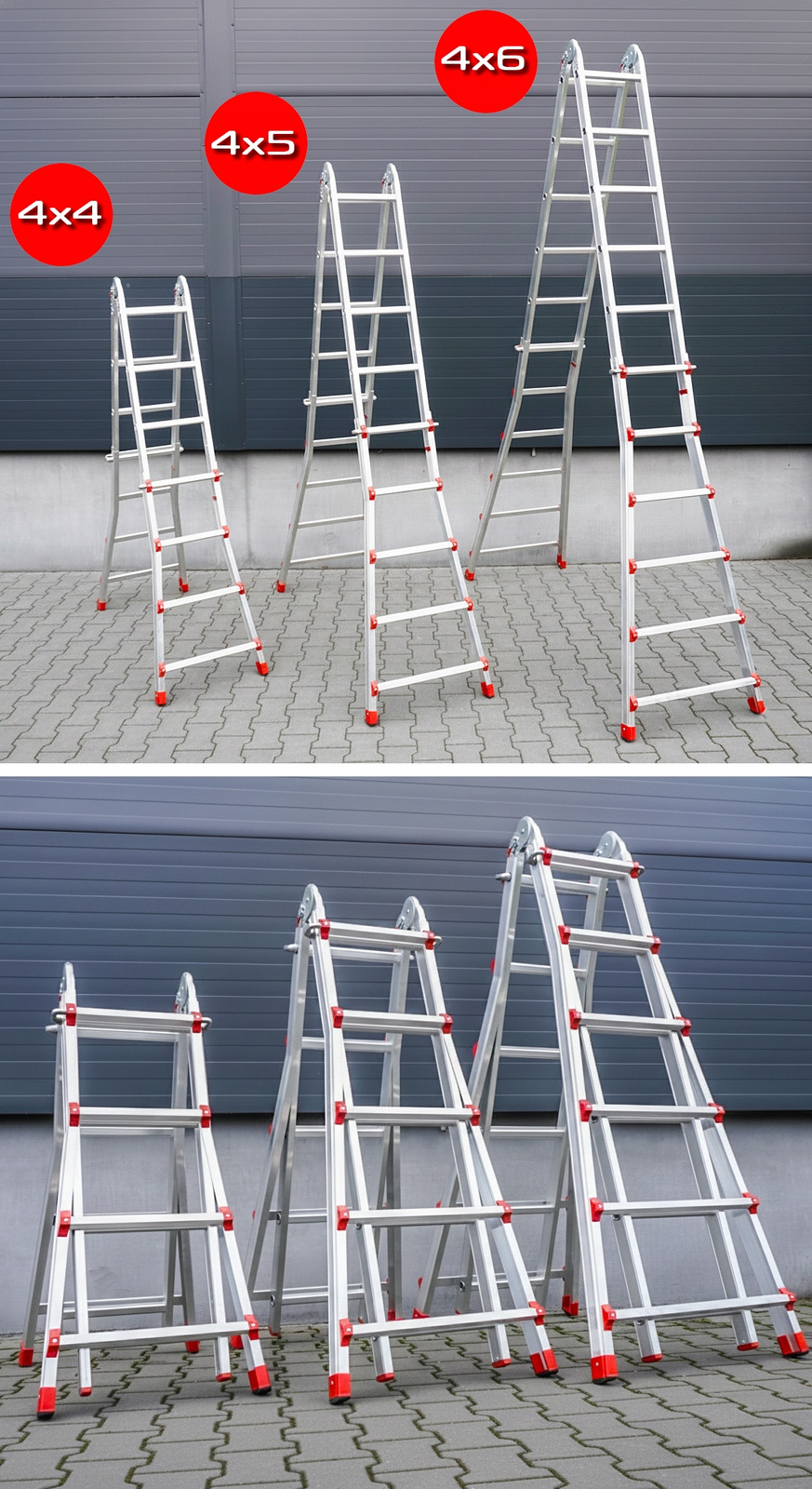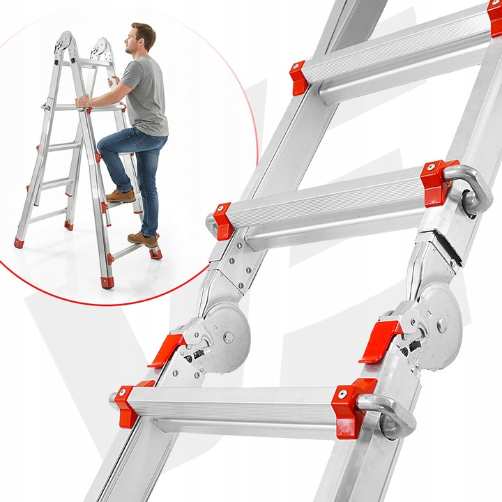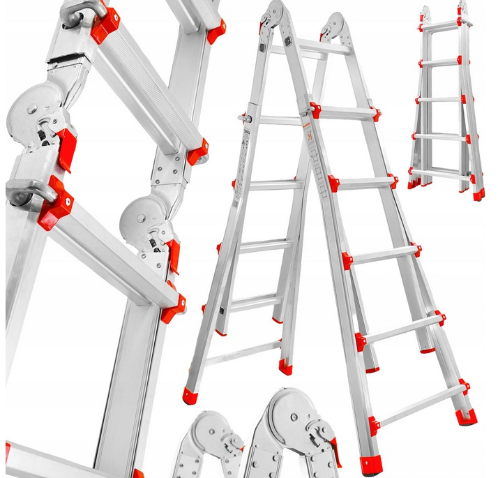 Wielofunkcyjna drabina aluminiowa z możliwością ustawienia jej w kilku konfiguracjach. Wykonana jest z lekkiego aluminium, co zapewnia wysoką wytrzymałość przy jednoczesnym niewielkim ciężarze.