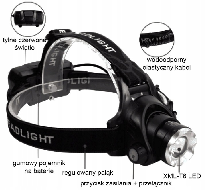 - Czołówka wyposażona jest w regulację - ZOOM - dzięki czemu posiada płynną regulację skupienia wiązki światła od bardzo szerokiej o niewielkim zasięgu do silnie skupionej o znacznym zasięgu.