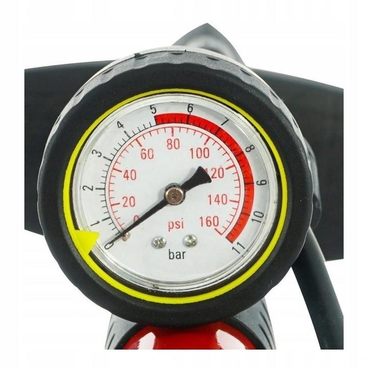 Czytelny manometr pokazujący w barach (0-11) oraz PSI (0-160).