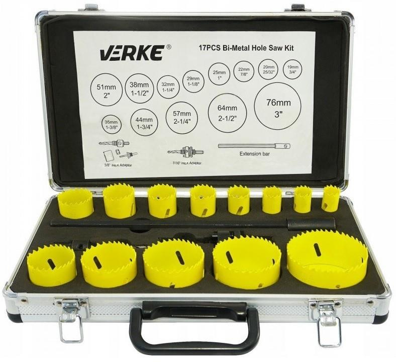 Zestaw profesjonalnych otwornic bimetalowych VERKE do wiercenia dużych otworów w metalach, blachach, kształtownikach i rurach. Doskonały także do wiercenia w tworzywach sztucznych, płytach meblowych, konstrukcyjnych płytach warstwowych oraz żywicach. Polecany do użytku zawodowego w przemyśle, serwisach oraz warsztatach, jak i w gospodarstwie domowym. Otwornice wykonane zostały z materiałów najwyższej jakości – zęby ze stali szybkotnącej HSS. Progresywny profil zębów wzmaga agresywne cięcie. Zestaw składa się z 17 elementów, całość w poręcznej walizce aluminiowej, co ułatwia transport oraz składowanie, a także zabezpiecza towar przed uszkodzeniami mechanicznymi.