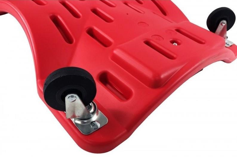 - Otwory widoczne pod spodem wzmacniają konstrukcję a koła na łożyskach pozwalają na swobodne przemieszczanie się pod samochodem.