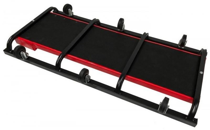 • Konstrukcja leżanki warsztatowej opiera się na 6 gumowych kołach podporowych umożliwiających przemieszczanie się w dowolnym kierunku.