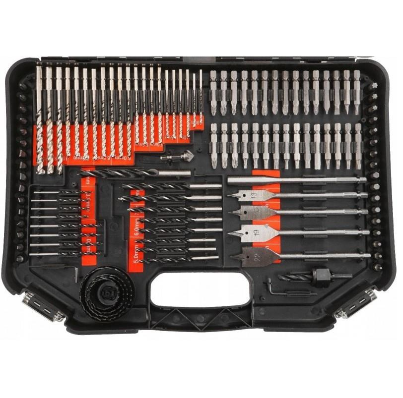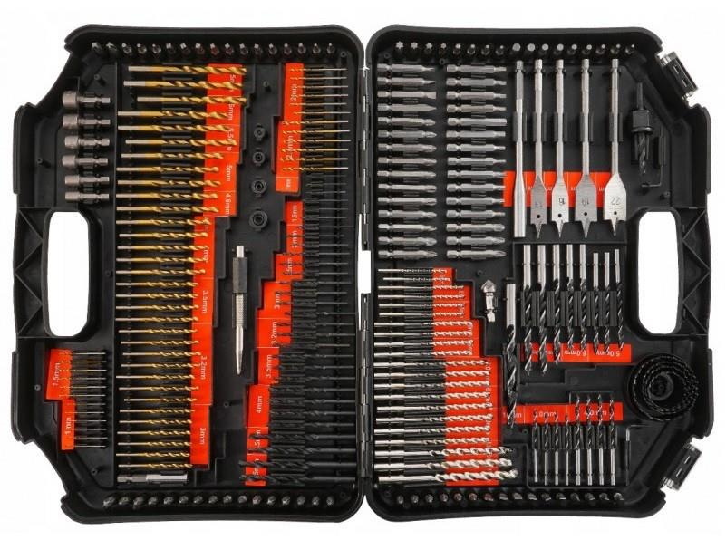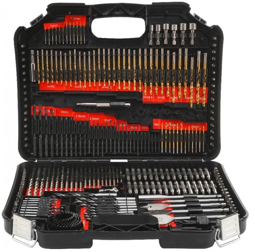 • Wiertła HSS: 1 mm x 6; 1,5 mm x 6; 2,0 mm x 6; 2,5 mm x 6; 3 mm x 7; 3,2 mm x 6; 3,5 mm x 4; 4 mm x 4; 4,5 mm x 1; 4,8 mm x 1; 5 mm x 4; 5,5 mm x 2; 6 mm x 2; 6,5 mm x 2