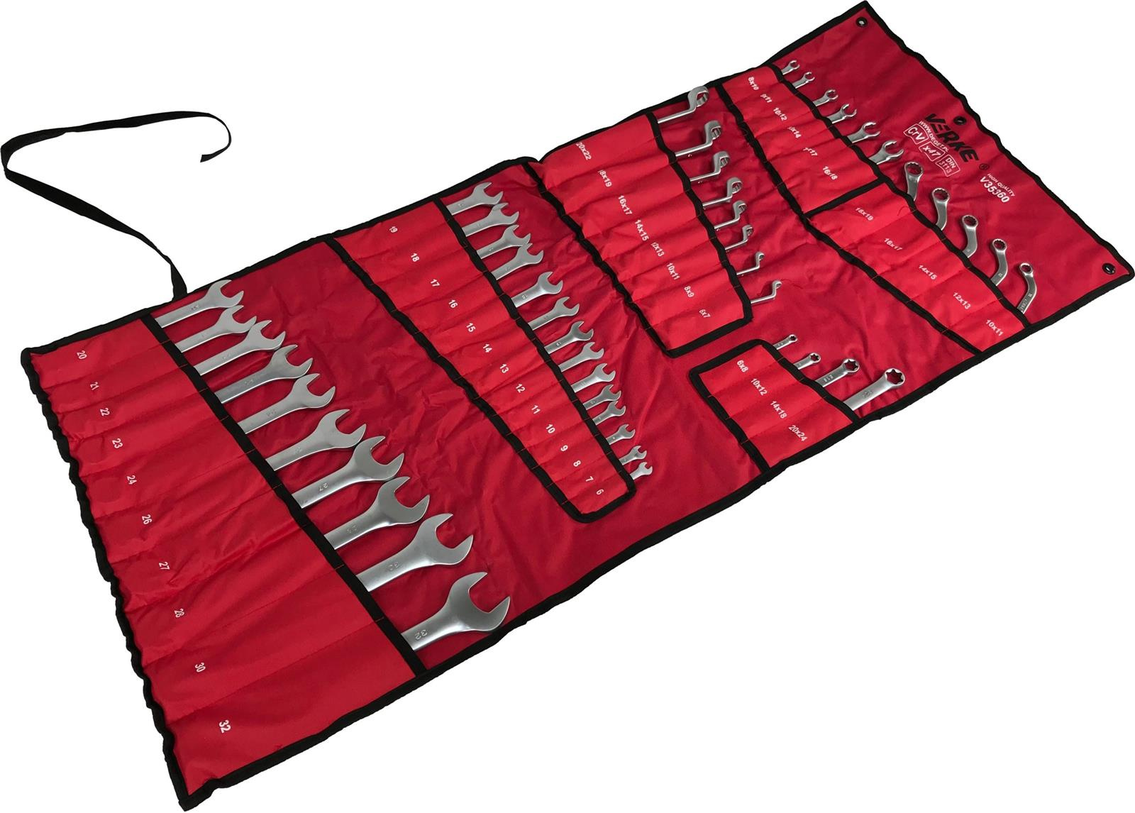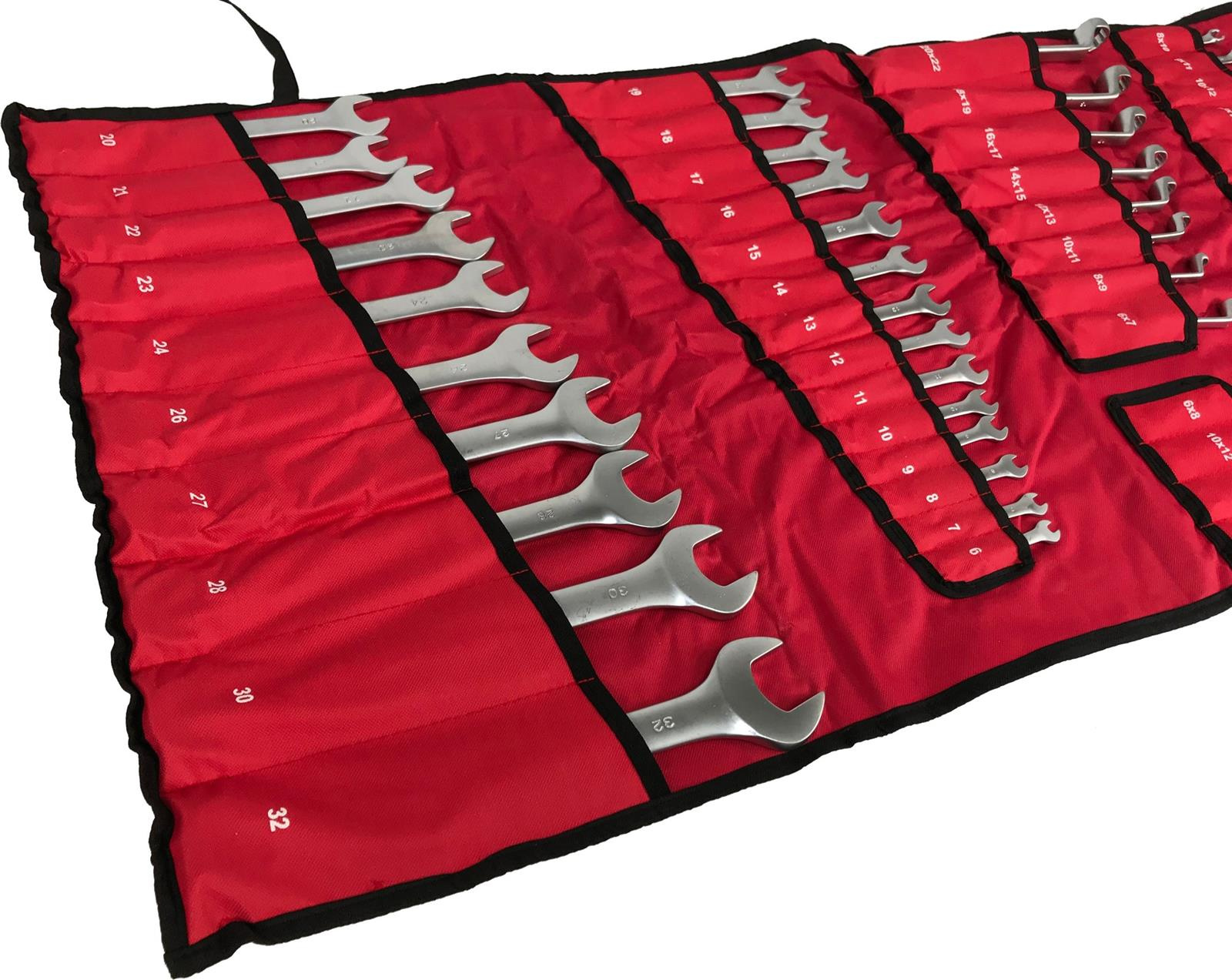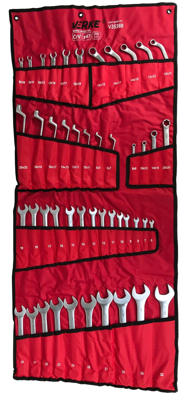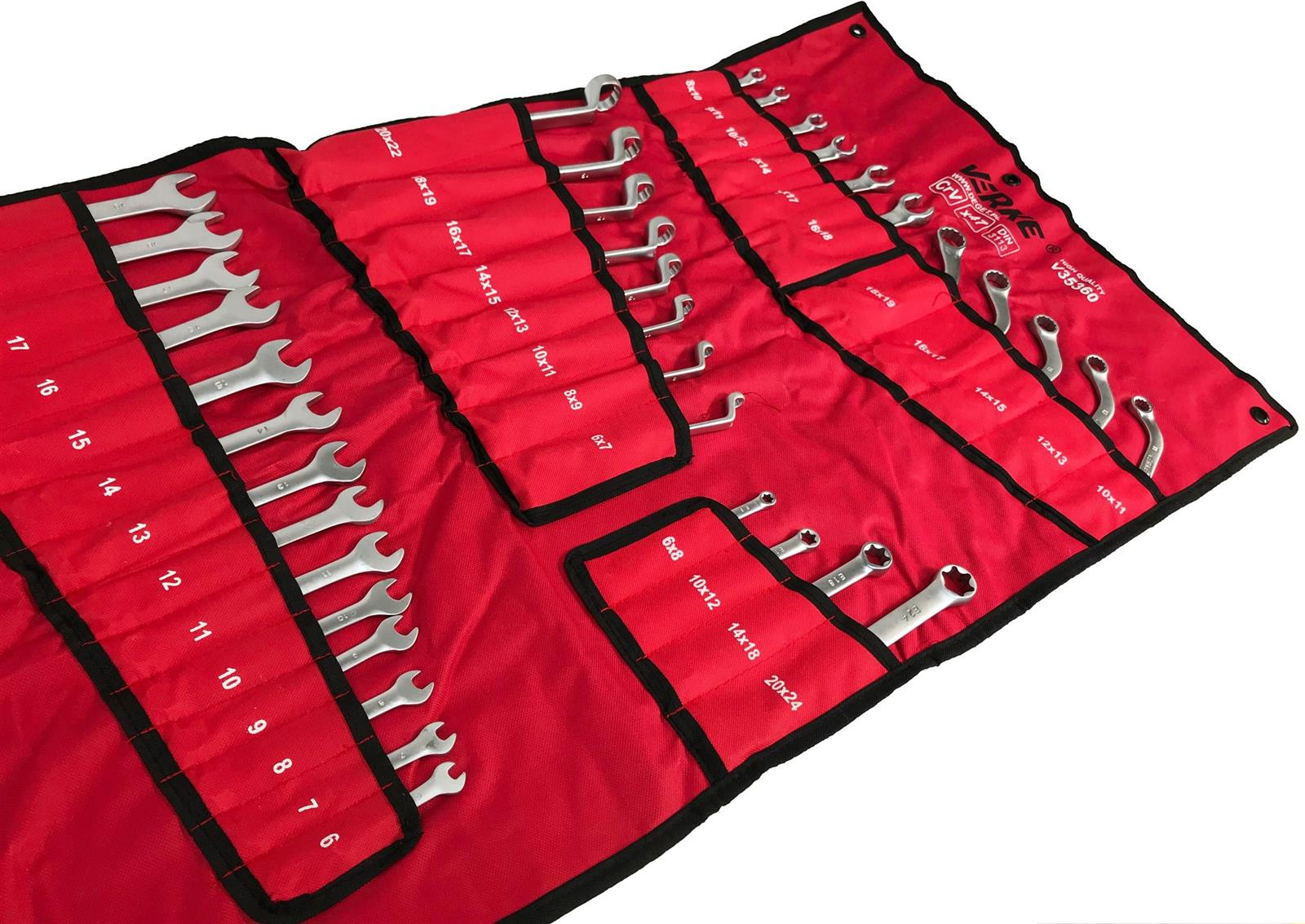 Bardzo wysokiej jakości klucze płasko-oczkowe wykonane ze stali chromo-wanadowej. Przeznaczone do pracy zarówno w warunkach domowych jak i w profesjonalnym warsztacie. Spełniają normy DIN 3113. Klucze mają estetyczne satynowe wykończenie. Całość zapakowana została w wygodne zwijanie etui, dzięki czemu zajmuje mało miejsca. Pokrowiec wykonany jest z bardzo mocnego i wytrzymałego materiału, a otwory w jego górnych rogach umożliwiają powieszenie ich na ścianie.