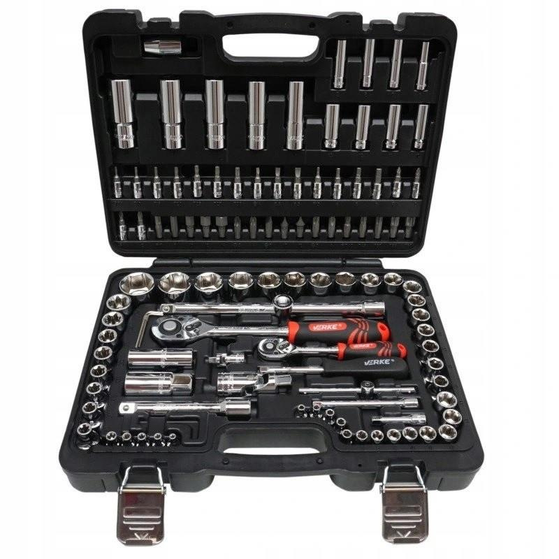 Profesjonalny zestaw narzędziowy 108 elementów. Klucze nasadowe, jak i napęd nasadek, zostały wykonane z wytrzymałej narzędziowej stali chromowo-wanadowej CR-V. Grzechotki posiadają 72 zęby (skok roboczy 5 stopni). Narzędzia produkowane są na Tajwanie, przy użyciu najwyższej jakości materiałów, najnowszych technologii oraz patentów. Dzięki połączeniu tych czynników otrzymujemy produkt profesjonalnej jakości o ogromnej wytrzymałości. Narzędzia firmy VERKE premium line, dzięki wysokiej jakości wykonania i trwałości oraz innowacyjnym rozwiązaniom, zyskują coraz szerszą grupę zadowolonych użytkowników. Różnorodność produktów VERKE, daje możliwość szerokiego zakresu zastosowania od profesjonalnych warsztatów samochodowych po przydomowe garaże.